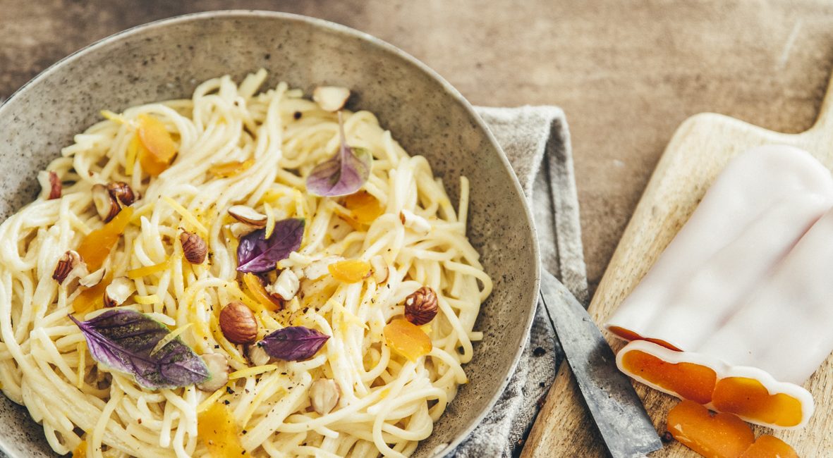 Tranchez la poutargue très finement, puis retirez la cire. Ajoutez la poutargue et les noisettes concassées aux spaghettis et servez sans attendre.
