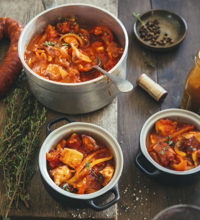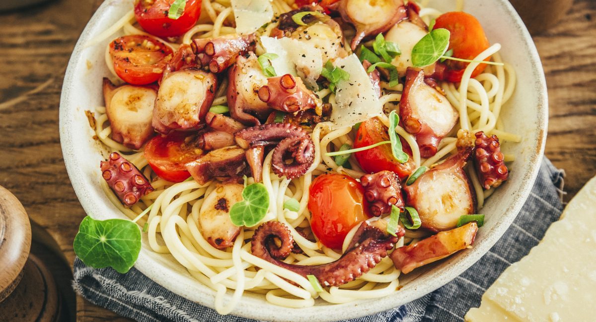 Coupez les tentacules de poulpe en morceaux. Pelez et hachez les gousses d’ail. Coupez les tomates cerises en deux.