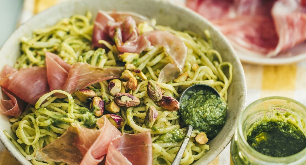 Mélangez bien pour enrober les pâtes de pesto. Ajoutez les lanières de jambon de Parme et mélangez délicatement.