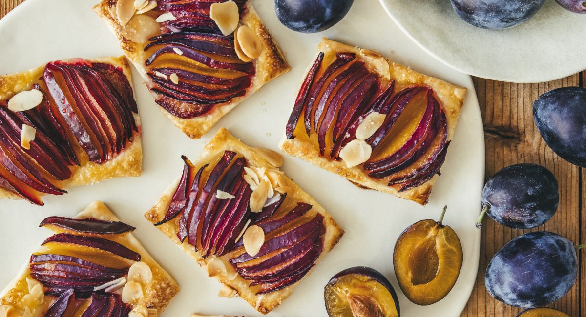 Disposez les lamelles de quetsches sur les carrés de pâte feuilletée, puis saupoudrez le tout de cassonade et d’amandes effilées.
