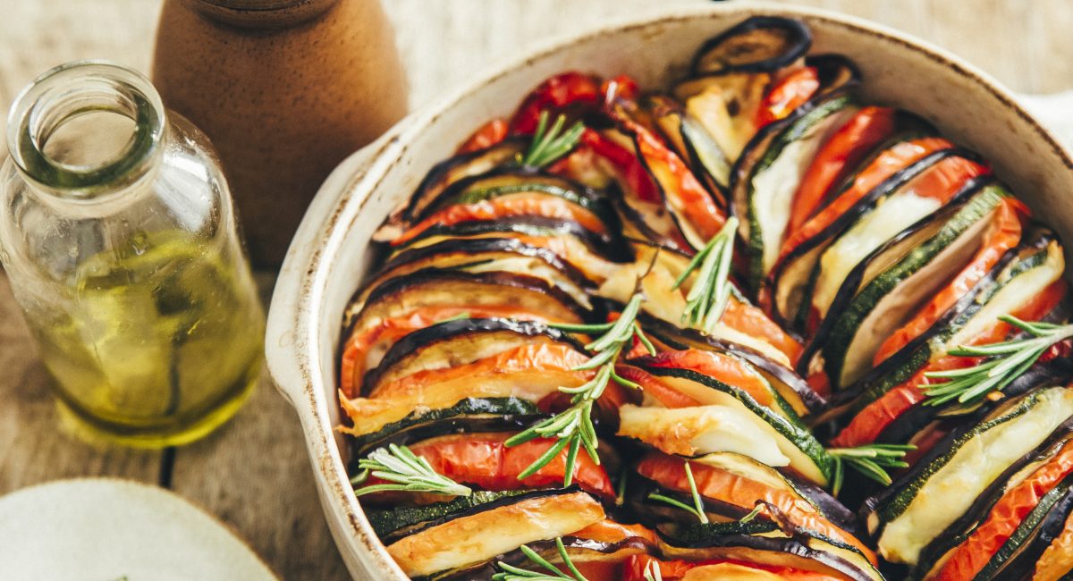 Disposez les légumes et les tranches de mozzarella dans le plat en alternant les couleurs. Assaisonnez de sel et de poivre et arrosez d’un filet d’huile d’olive.