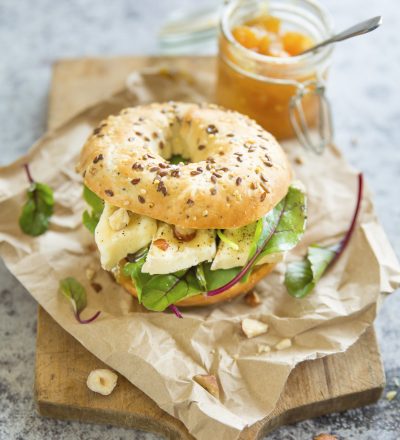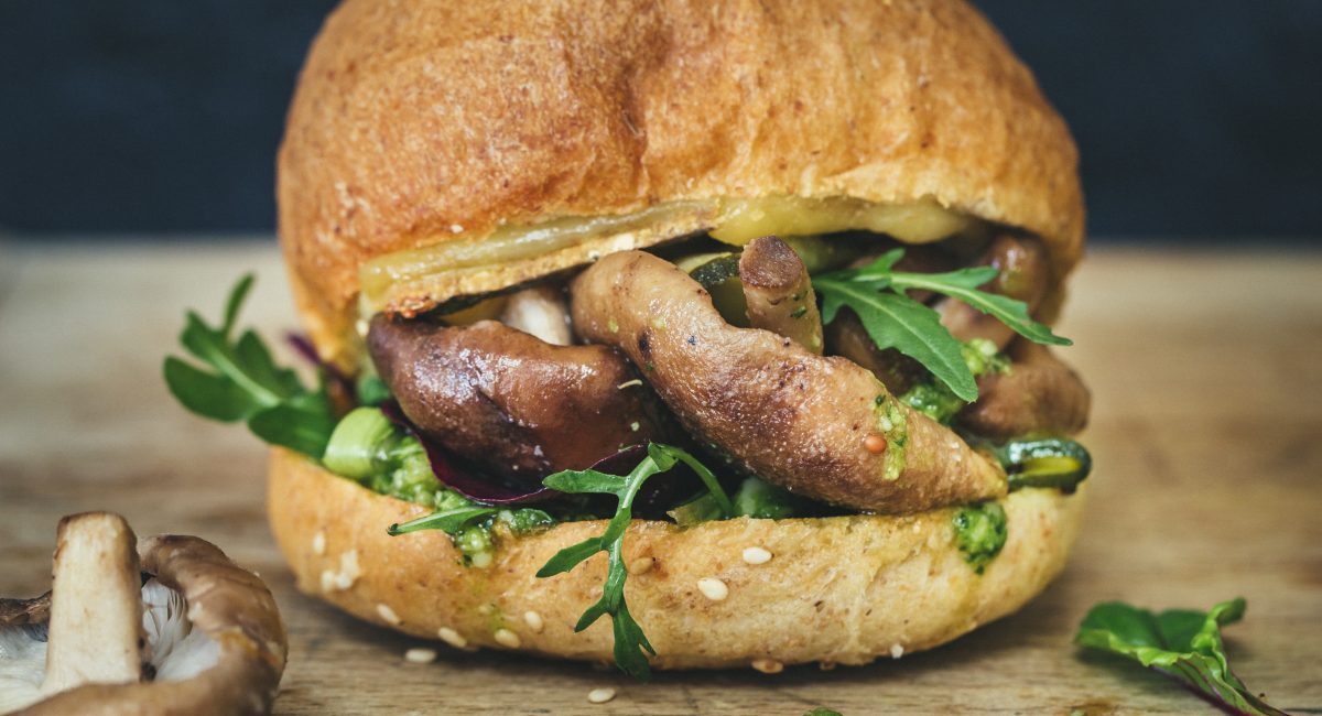 Étalez le pesto sur la partie basse des pains à burger, ajoutez quelques pousses de mesclun, les shiitakés et couvrez le tout du chapeau avec le fromage. Servez sans attendre.